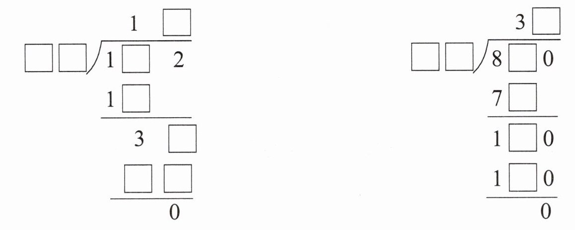$\begin{array}{r}1□\\□□\enclose{longdiv}{1□2}\\1□\\\hline3□\\□□\\\hline0\end{array}$ $\begin{array}{r}3□\\□□\enclose{longdiv}{8□0}\\7□\\\hline1□0\\1□0\\\hline0\end{array}$