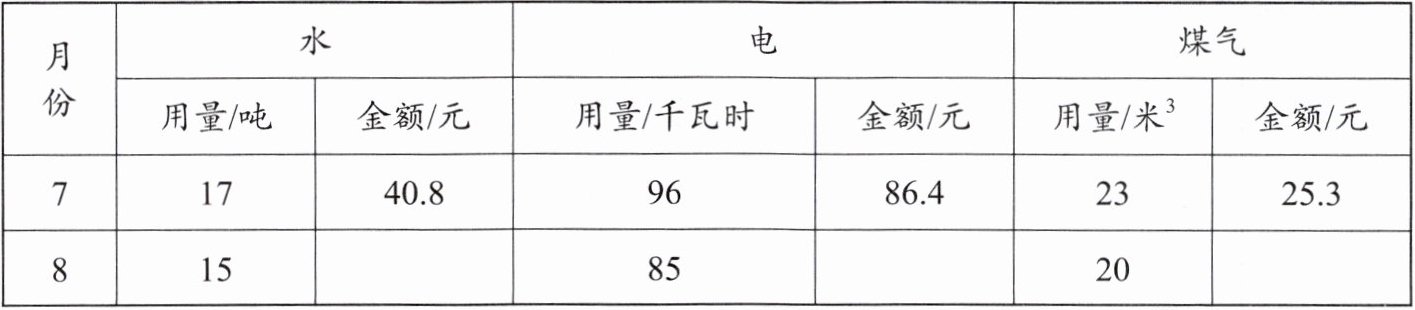 12. 下面是小东家七、八月份的水、电、煤气的收费表。请根据表中数据算出他家8月的水、电、煤气费。