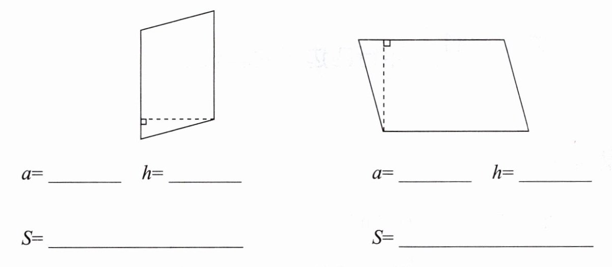5. 量出下面平行四边形的底和高的长度,并分别计算它们的面积。