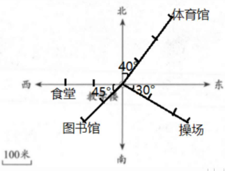(3) 体育馆在教学楼北偏东40°方向300米处。