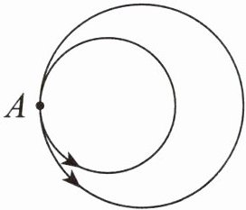 如图,两个圆只有一个公共点 A,两只甲虫同时从 A 点出发,按箭头所指方向以相同的速度分别在大、小两个圆上爬行。已知两个圆的直径分别是 48 厘米和 32 厘米。问:当小圆上的甲虫爬行 6 整圈时,大圆上的甲虫爬行多少圈?