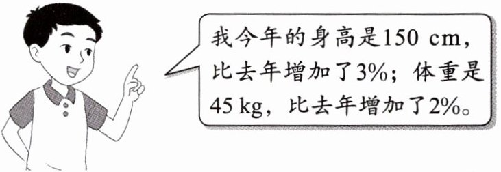 身高:解:设去年的身高为x cm。$(1+3\%)x=150$ $x\approx 146$体重:解:设去年的体重为x kg。$(1+2\%)x=45$ $x\approx 44$