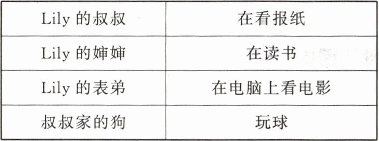 Lily 上周六下午去了她叔叔家。请根据表格信息,写一篇约 70 个单词的英文短文,描述她刚到叔叔家时看到的情景,可适当发挥。