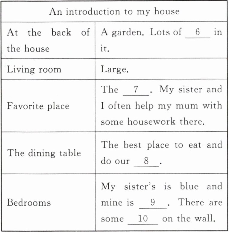 A. 6. fish 7. kitchen 8. homework 9. pink 10. posters B. The speaker is introducing her house to us. My house is lovely. At the back of the house there is a garden with a pond in it. There are lots of fish in the pond. The house is large. There is a large living room but my favorite place in the house is the kitchen. My sister and I often help my mum with some housework in the kitchen. The dining table is the best place to eat and do our homework at the same time. There are three bedrooms and a bathroom in the house. My sister's bedroom is blue and my room is pink. My bedroom is very beautiful. There are some posters of movie stars on the walls.