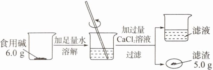 :左侧烧杯装有 $6.0\mathrm{g}$食用碱,加足量水得中间装有溶液的烧杯,加过量$\mathrm{CaCl}_{2}$溶液后过滤,得到右侧装有滤液的烧杯和$5.0\mathrm{g}$滤渣