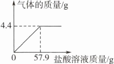:气体的质量/$\mathrm{g}$随盐酸溶液质量/$\mathrm{g}$增加而增加,曲线先上升后平稳,上升段到横坐标$57.9$、纵坐标$4.4$ ,平稳段纵坐标是$4.4$