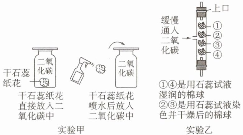 。(2)实验甲中干石蕊纸花喷水后放入二氧化碳中,观察到的现象是