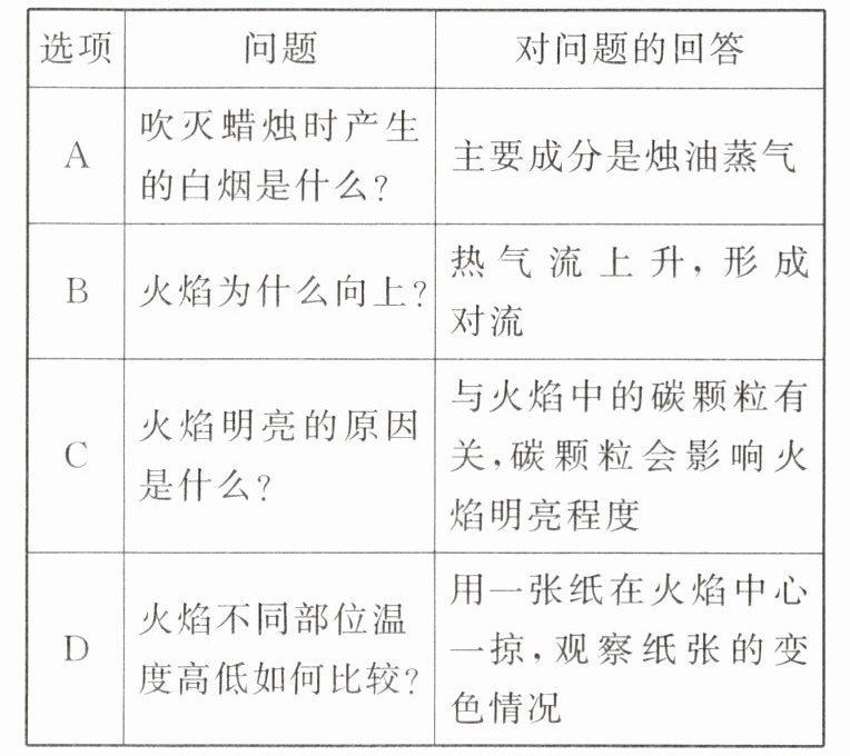 8. (中考·滨州)下表列举了法拉第《蜡烛的故事》中涉及的部分问题及对问题的回答,其中“对问题的回答”属于“设计实验方案”的是(