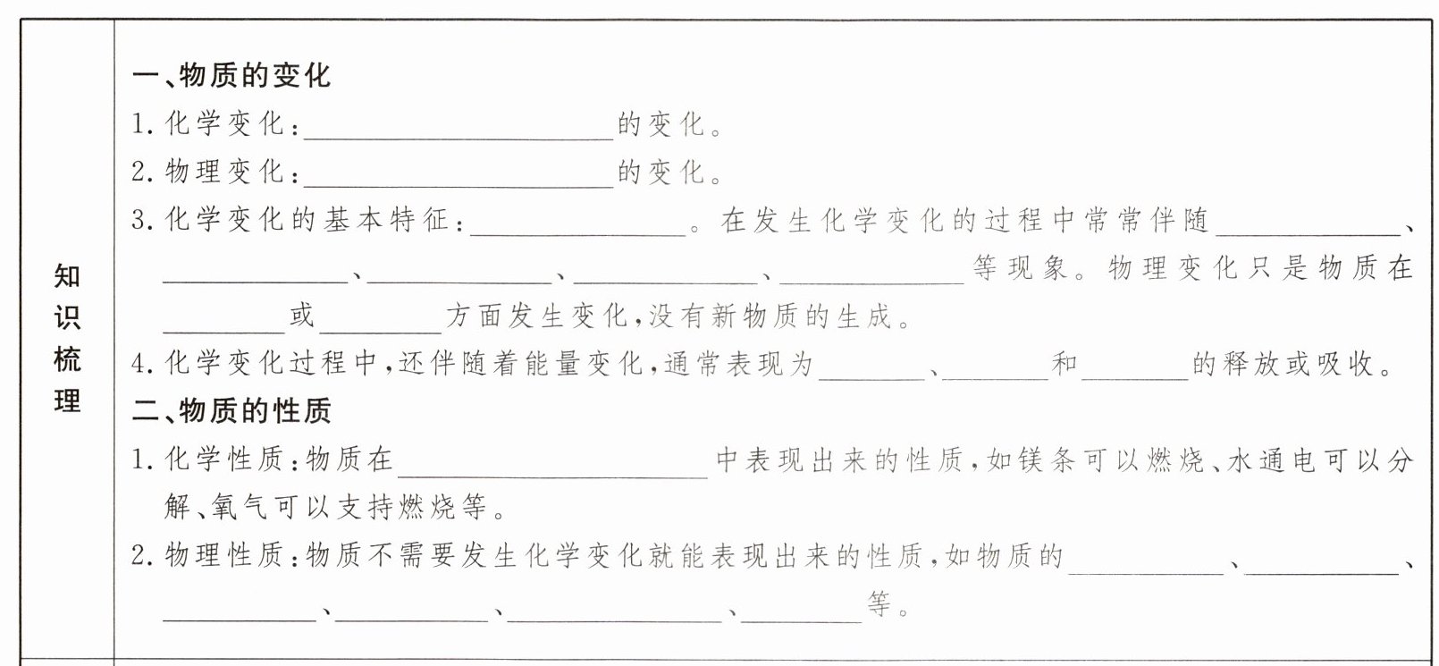 一、1.生成新物质 2.没有生成新物质 3.有新物质生成 发光 发热 颜色变化 产生气体 生成沉淀 形状 状态 4.热能 光能 电能 二、1.化学变化 2.颜色 气味 密度 熔点 沸点 导电性