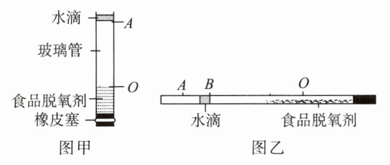 ②将食品脱氧剂粉末迅速装入玻璃管,立即向管口注入一滴水将玻璃管密封,水滴的下端标为A,弹动玻璃管使脱氧剂粉末分布均匀且紧密,脱氧剂的上端标为O,如图甲所示。