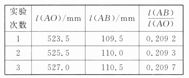 ④用刻度尺测量出AO段和AB段的长度[ $ l(AO) $ 和 $ l(AB) $ ],并计算出AB与AO段长度的比值 $\left[\dfrac{l(AB)}{l(AO)}\right]$ ,将数据记录在表格中。