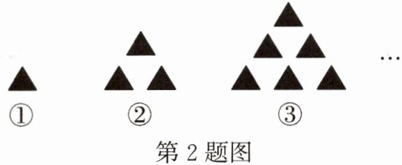 2. 把黑色三角形按如图所示的规律拼图案,其中第①个图案中有1个黑色三角形,第②个图案中有3个黑色三角形,第③个图案中有6个黑色三角形,…,按此规律排列下去,则第⑤个图案中黑色三角形的个数为( )。