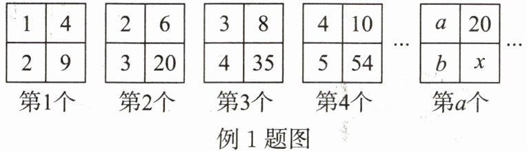 [解答] 解题关键在于从特殊的结果入手寻找规律。根据表格可得规律:第 $ n $ 个表格中,左上数字为 $ n $,左下数字为 $ n + 1 $,右上数字为 $ 2(n + 1) $,右下数字为 $ 2(n + 1)(n + 1) + n $,所以 $ 20 = 2(n + 1) $,解得 $ n = 9 $,所以 $ a = 9 $,$ b = 10 $,$ x = 10×20 + 9 = 209 $。