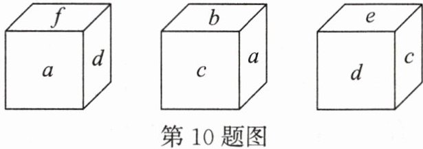10. 有一个正方体,将它的各个面上标上字母$a$,$b$,$c$,$d$,$e$,$f$。有甲、乙、丙三个同学站在不同的角度观察,结果如图。