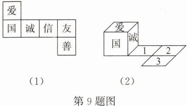 9. 已知图(1)是图(2)所示的小正方体的表面展开图,小正方体从图(2)所示的位置依次翻到第 1 格、第 2 格、第 3 格,这时小正方体朝上一面的字是______。