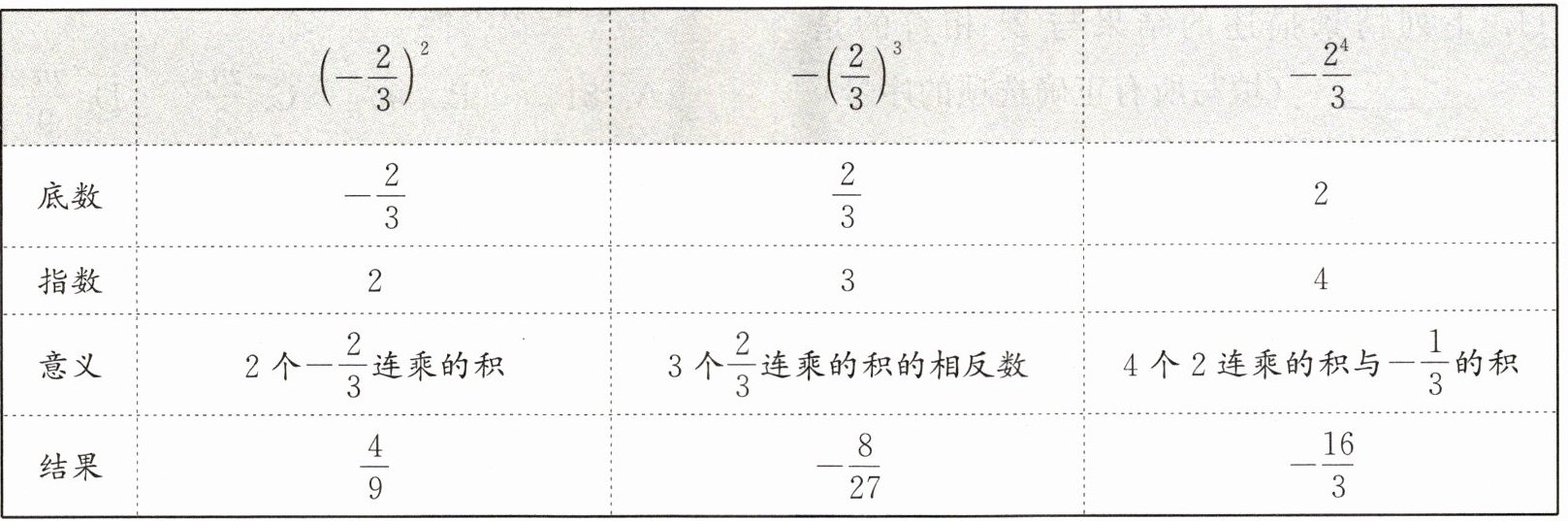 | 意义 | $2$个$-\dfrac{2}{3}$连乘的积 | $3$个$\dfrac{2}{3}$连乘的积的相反数 | $4$个$2$连乘的积与$-\dfrac{1}{3}$的积 |