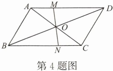 4. 如图所示,在$□ ABCD$中,对角线$AC$,$BD$相交于点$O$,过点$O$的直线分别交$AD$,$BC$于点$M$,$N$。若$\triangle CON$的面积为$2$,$\triangle DOM$的面积为$4$,则$\triangle COB$的面积为