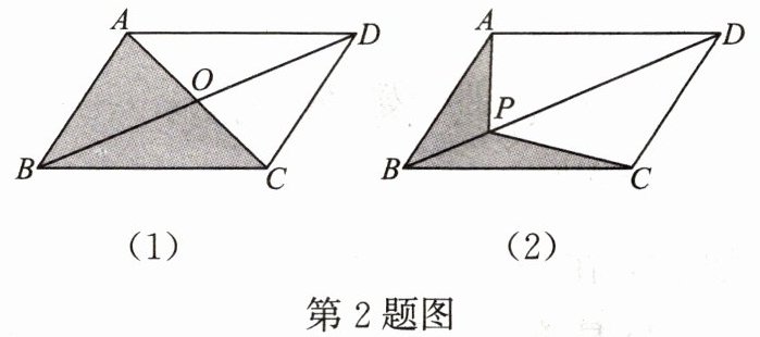 (2) 如图(2)所示,设点$P$为对角线$BD$上的任一点(点$P$与点$B$,$D$不重合),$S_{\triangle ABP}$与$S_{\triangle CBP}$相等吗?若相等,请证明;若不相等,请说明理由。