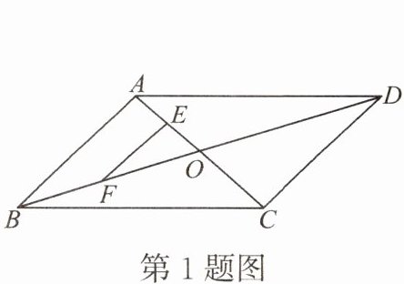1. 如图,$ □ ABCD $ 的对角线 $ AC $,$ BD $ 相交于点 $ O $,点 $ E $,$ F $ 分别是线段 $ AO $,$ BO $ 的中点. 若 $ AC + BD = 24 cm $,$ \triangle OAB $ 的周长是 $ 18 cm $,则 $ EF = $