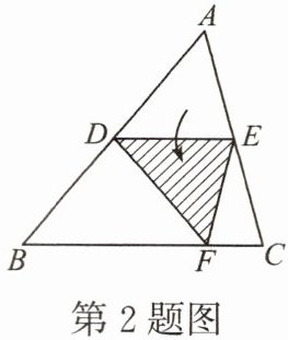 2. 如图,$ \triangle ABC $ 的中位线 $ DE = 5 cm $,把 $ \triangle ABC $ 沿 $ DE $ 折叠,使点 $ A $ 落在边 $ BC $ 上的点 $ F $ 处. 若 $ A $,$ F $ 两点间的距离是 $ 8 cm $,则 $ \triangle ABC $ 的面积为