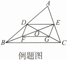 例题 如图,在 $ \triangle ABC $ 中,点 $ D $,$ E $ 分别是边 $ AB $,$ AC $ 的中点,$ BE $,$ CD $ 相交于点 $ O $,点 $ F $,$ G $ 分别是线段 $ OB $,$ OC $ 的中点. 求证:$ DG $,$ EF $ 互相平分.