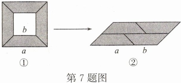 7. 乐乐从边长为$a$的大正方形纸板中挖去一个边长为$b$的小正方形纸板后,将其裁成四个相同的等腰梯形(如图①所示),然后拼成一个平行四边形(如图②所示). 那么通过计算两个图形阴影部分的面积,可以验证成立的公式为(