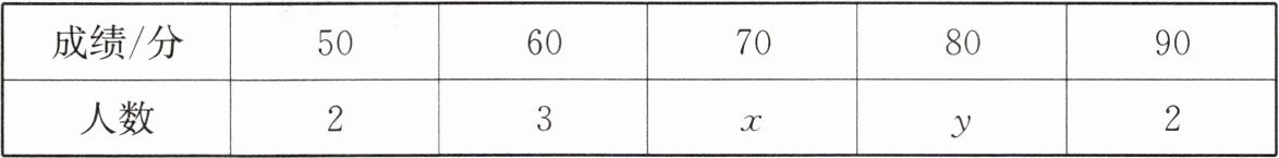 $\begin{cases}2 + 3 + x + y + 2 = 20, \\50 × 2 + 60 × 3 + 70x + 80y + 90 × 2 = 72 × 20\end{cases}$