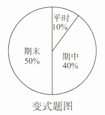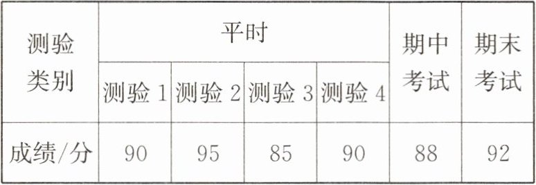 所以总评成绩为$\frac{84×10\% + 82×30\% + 90×60\%}{10\% + 30\% + 60\%} = 87$(分).