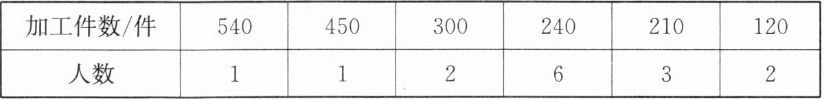 (1)平均数:$\frac{1}{15}(540×1 + 450×1 + 300×2 + 240×6 + 210×3 + 120×2)=260$(件);