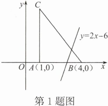 1. 如图,把 $ Rt \triangle ABC $ 放在平面直角坐标系内,其中 $ \angle CAB = 90^{\circ} $,$ BC = 5 $,点 $ A $,$ B $ 的坐标分别为 $ (1,0) $,$ (4,0) $。将 $ \triangle ABC $ 沿 $ x $ 轴向右平移,当点 $ C $ 落在直线 $ y = 2x - 6 $ 上时,线段 $ BC $ 扫过的面积为多少?