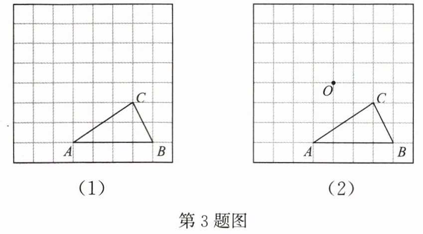 3. 在图(1)(2)中分别画出△ABC 绕点 A 按逆时针方向旋转 90°后的图形、绕点 O 按顺时针方向旋转 90°后的图形。