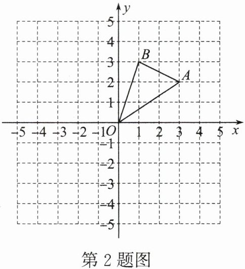 2. 如图,在边长为 $1$ 的正方形组成的网格中建立平面直角坐标系,$\triangle AOB$ 的顶点均在格点上,点 $O$ 为原点,点 $A$,$B$ 的坐标分别是 $A(3, 2)$,$B(1, 3)$。