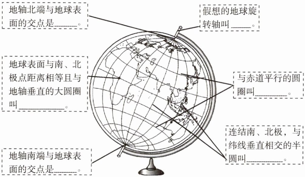 结合概念,在图中填出地球仪上主要的点和线的名称。