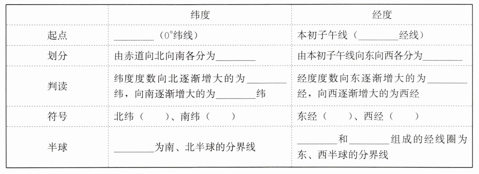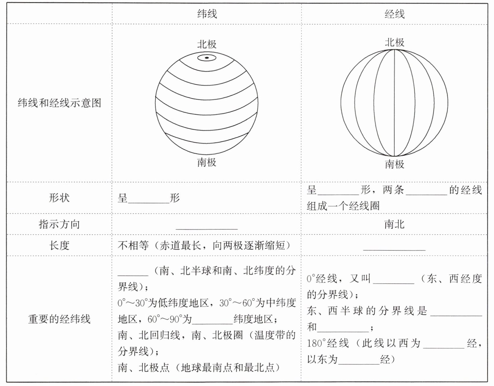 |重要的经纬线|赤道(南、北半球和南、北纬度的分界线);0°~30°为低纬度地区,30°~60°为中纬度地区,60°~90°为高纬度地区;南、北回归线,南、北极圈(温度带的分界线);南、北极点(地球最南点和最北点)|0°经线,又叫本初子午线(东、西经度的分界线);东、西半球的分界线是20°W和160°E;180°经线(此线以西为东经,以东为西经)|