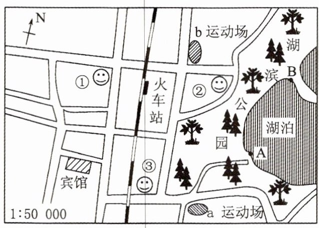 (填字母)。 (3)从地图上量得湖滨公园的A点到B点之间的距离是1.8厘米,则实地距离大约是