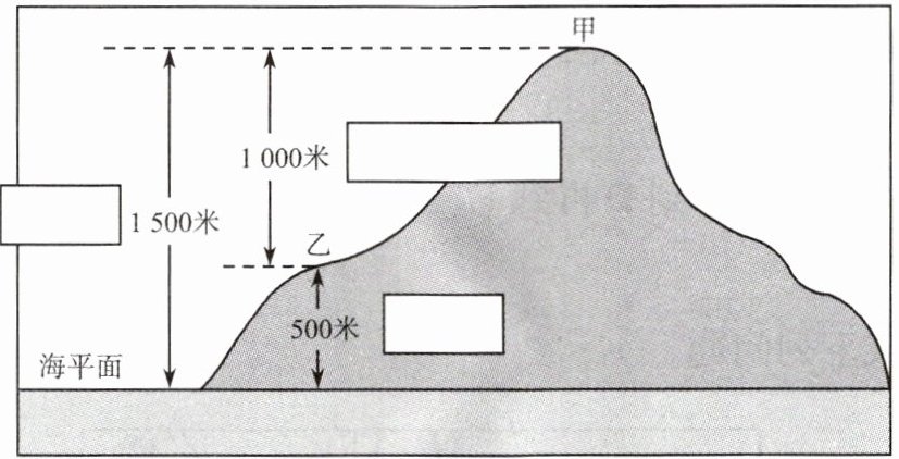 1. (左边1500米箭头旁方框填“海拔”,中间1000米箭头旁方框填“相对高度”)