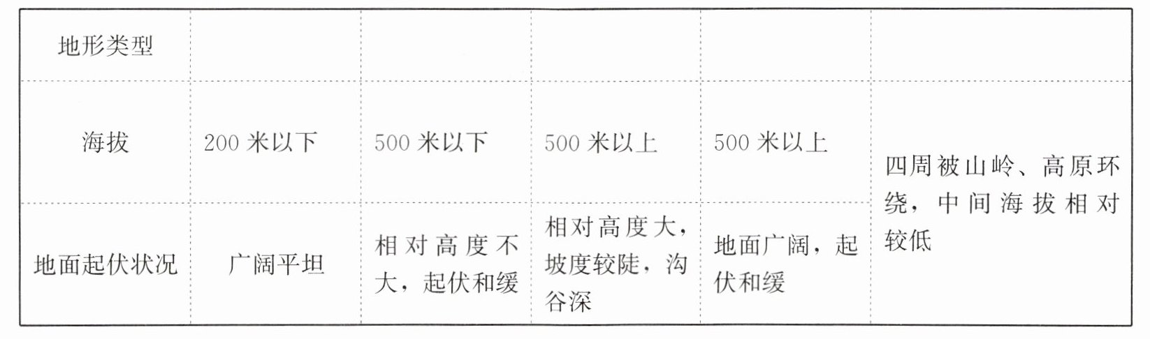 |地面起伏状况|广阔平坦|相对高度不大,起伏和缓|相对高度大,坡度较陡,沟谷深|地面广阔,起伏和缓|中间低平|