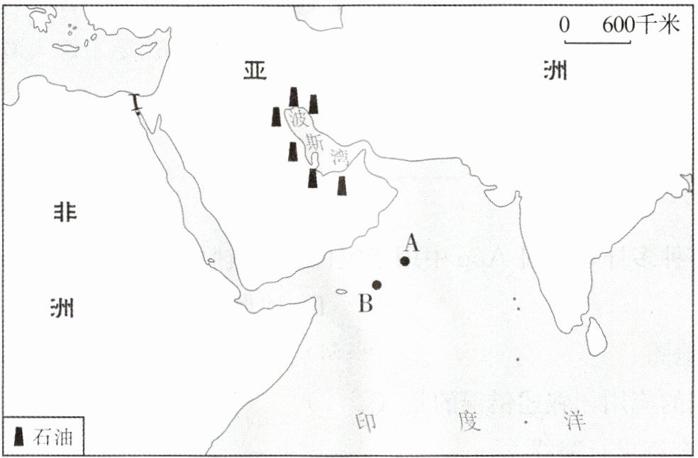 6. 某日,从波斯湾驶出的货船到达 B 点时发出求救信号,执行护航任务的 A 编队接到信号后,立即实施营救。读图,完成下列问题。