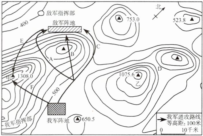 18. 右图为两军作战模拟形势图。读图,完成下列问题。(12 分)