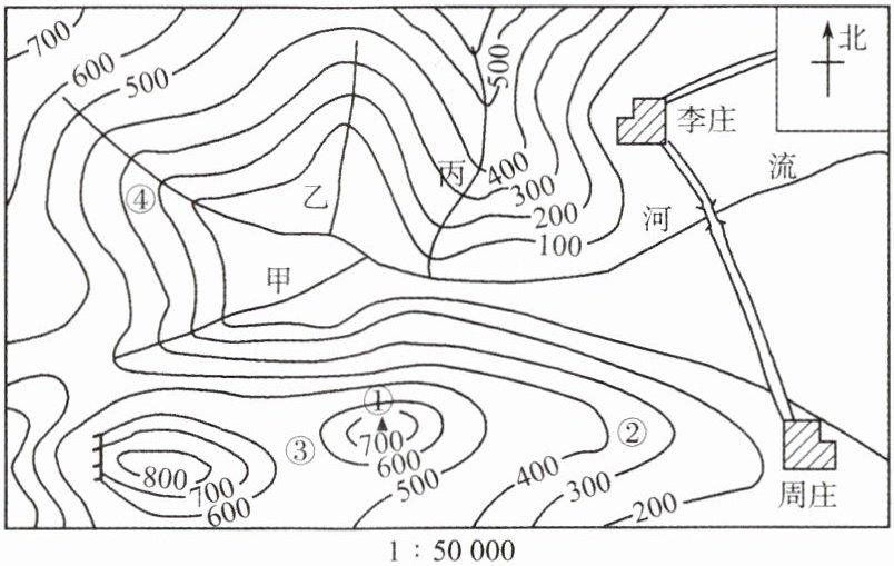 (1)山峰 山脊 鞍部 山谷 (2)图上1厘米代表实地距离500米 (3)东南 (4)李庄 (5)丙
