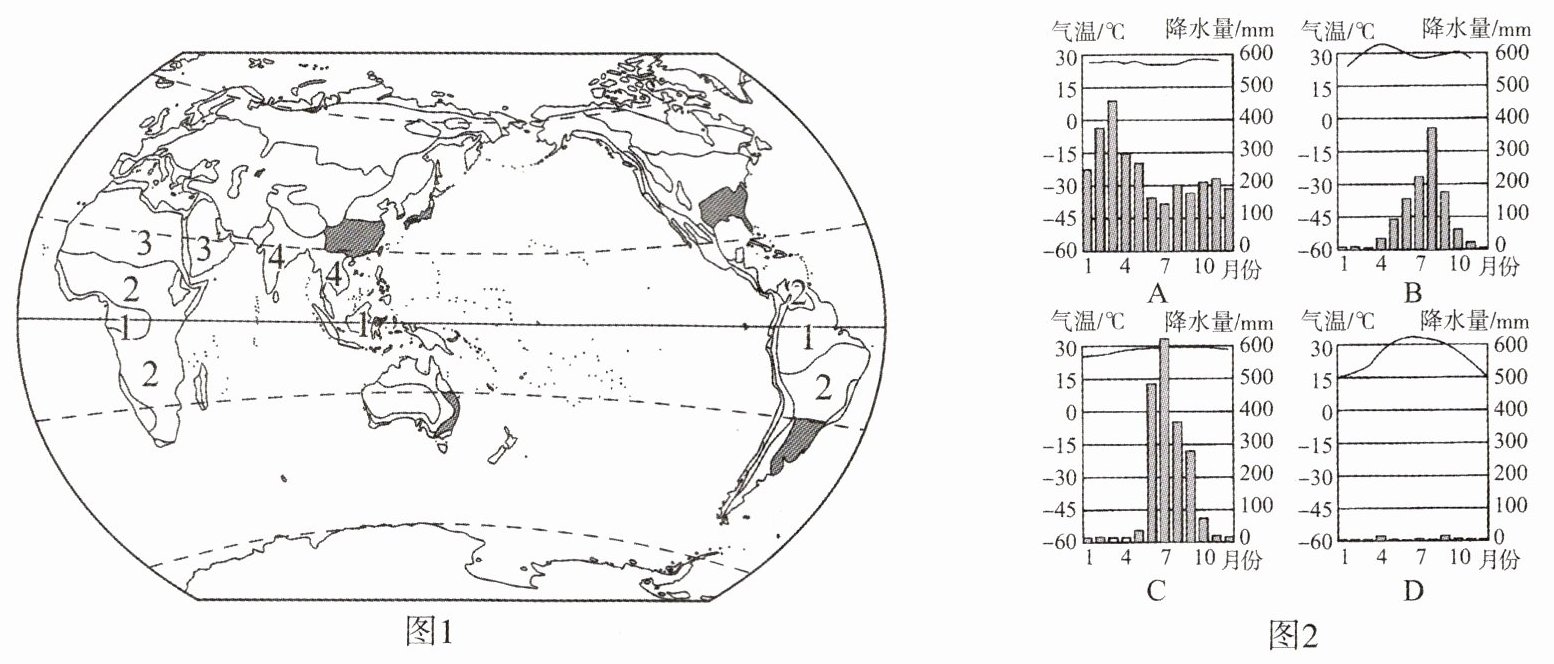 (1)热带雨林 1 热带草原 2 热带季风 4 热带沙漠 3