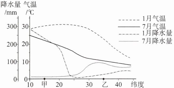 6. 读甲、乙两地气温变化曲线和降水量柱状图,完成6~7题。