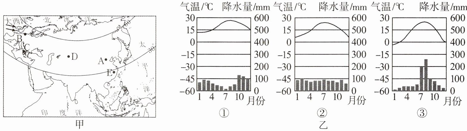。(4)乙图为三种气候类型气温变化曲线和降水量柱状图,请将其数码与甲图中代表的气候类型的字母对应起来。