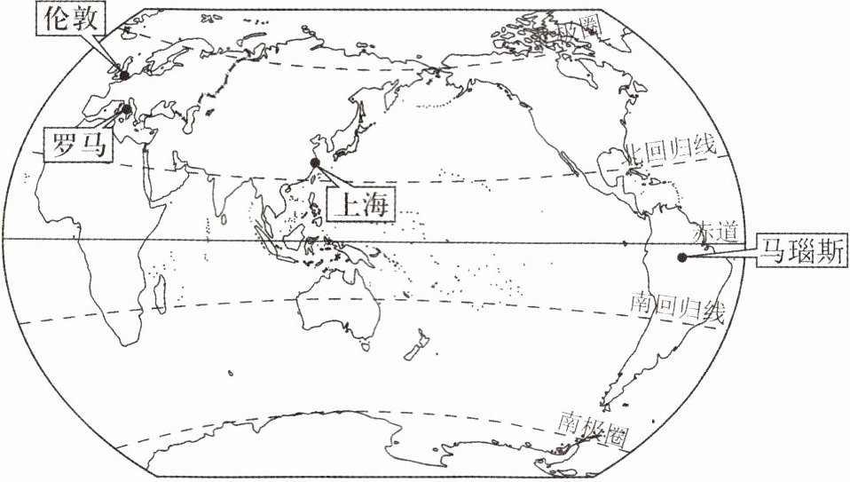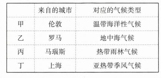 来自英国伦敦、意大利罗马、巴西马瑙斯、中国上海的甲、乙、丙、丁四位小朋友,在谈起自己家乡的气候特点时,说法各不相同。