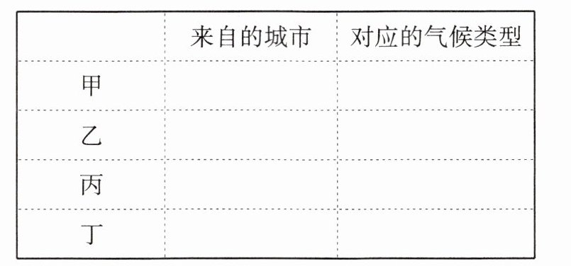 (1)根据小朋友们的描述,你能判断出他们分别来自哪个城市,对应的气候类型是什么吗?请把答案写在下面的表格内。