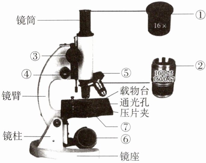 ① 目镜 ② 物镜 ③ 粗准焦螺旋 ④ 细准焦螺旋 ⑤ 转换器 转换器 ⑥ 反光镜 凹 平 ⑦ 遮光器 少 多 反光镜 遮光器