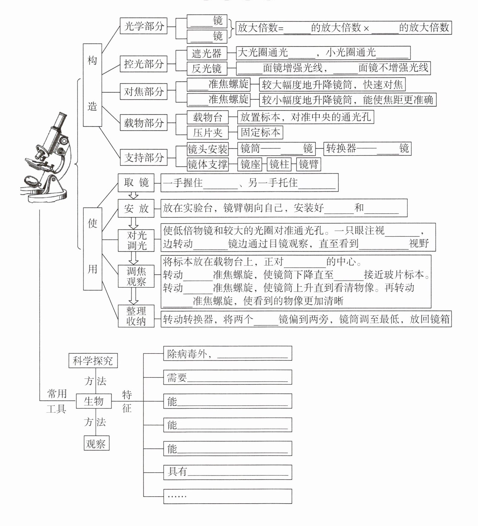 光学部分:目;物;目镜;物镜;控光部分:多;少;凹;平;对焦部分:粗;细;支持部分:目;物;取镜:镜臂;镜座;安放:目镜;物镜;对光:目镜;反光;明亮的;调焦观察:通光孔;粗;物镜;粗;细;整理收纳:物;生物特征:生物都是由细胞构成的;营养;进行呼吸;排出身体内产生的废物;对外界刺激作出反应;生长和繁殖;遗传和变异的特性
