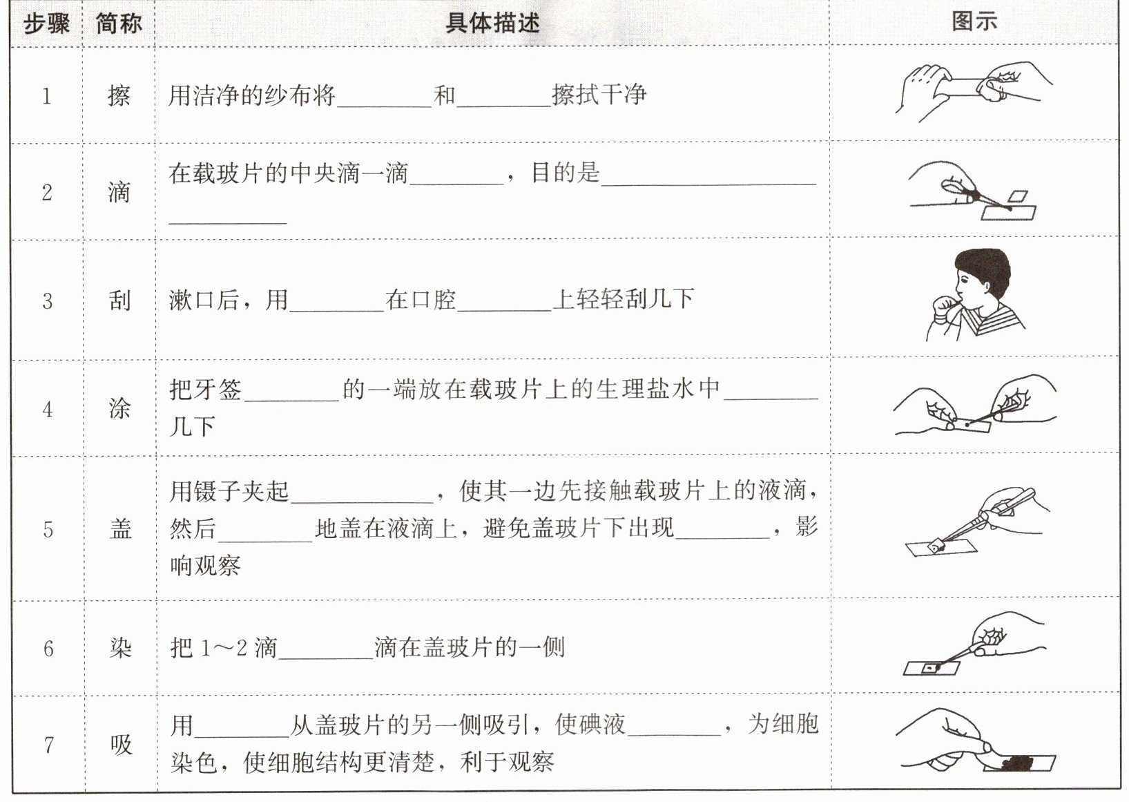 5.盖玻片 缓缓 气泡 6.碘液 7.吸水纸 浸润标本