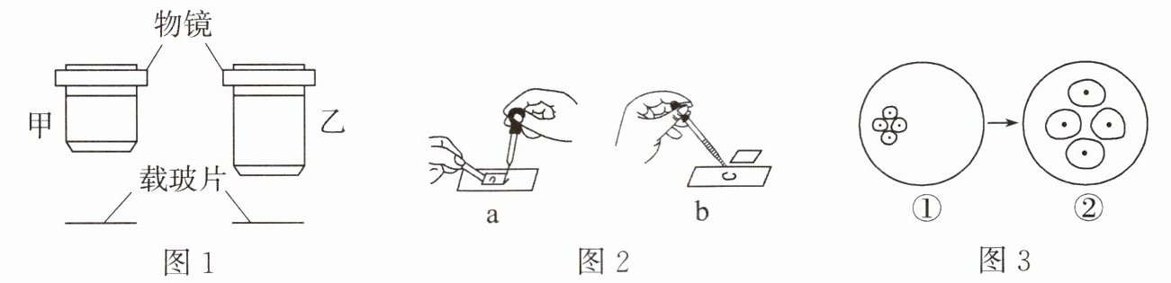 7. 用光学显微镜的一个目镜分别与图1中的物镜甲、乙进行组合,观察人的口腔上皮细胞临时装片。下列相关说法正确的是(
