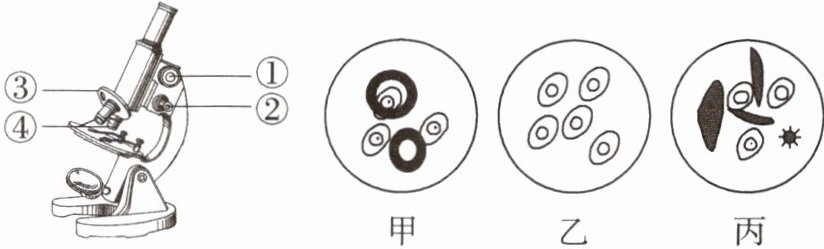 16. 在制作和观察人的口腔上皮细胞临时装片时,甲、乙、丙三位同学按照实验步骤进行操作。如图是显微镜的结构示意图以及甲、乙、丙三位同学在视野中看到的物像。请据图回答下列问题:
